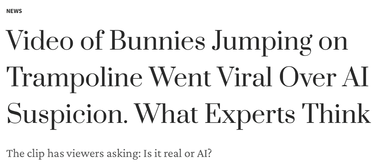This confidence leads nearly half of them to believe they can spot AI-generated content, a higher percentage than any other generation. Yet, this certainty is fragile. Do you remember "trampoline-gate"? A viral clip of bouncing bunnies that was entirely synthetic and fooled most of us.